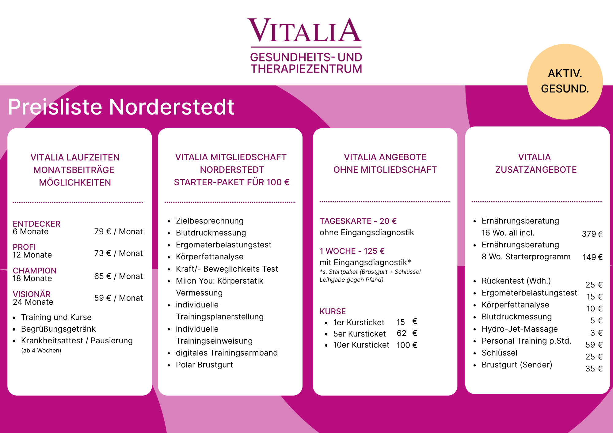 Damit Sie Ihre Ernährungsziele nicht nur kurzfristig, sondern dauerhaft erreichen, haben wir das VITALIA-16-Wochen-Ernährungsprogramm entwickelt. Schritt für Schritt begleiten wir Sie beim Einstieg, vermitteln fundiertes Wissen und unterstützen Sie dabei, neue Gewohnheiten erfolgreich in Ihren Alltag zu integrieren. So wird gesunde Ernährung für Sie nicht zur Pflicht – sondern zur Selbstverständlichkeit.