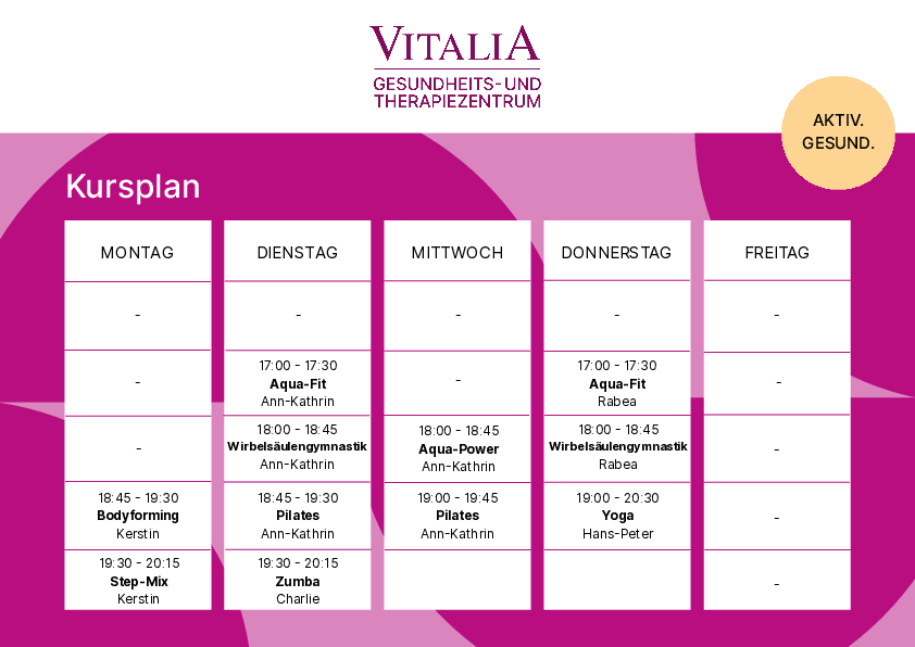 Ob entspannendes Yoga, kräftigendes Pilates, wirbelsäulenschonende Gymnastik, energiegeladene Aqua-Power oder mitreißendes Zumba – wir bieten Ihnen ein vielfältiges Kursangebot für jedes Fitnesslevel. Im Folgenden finden Sie unseren aktuellen Kursplan sowie die Preisliste für unsere Mitgliedschaften