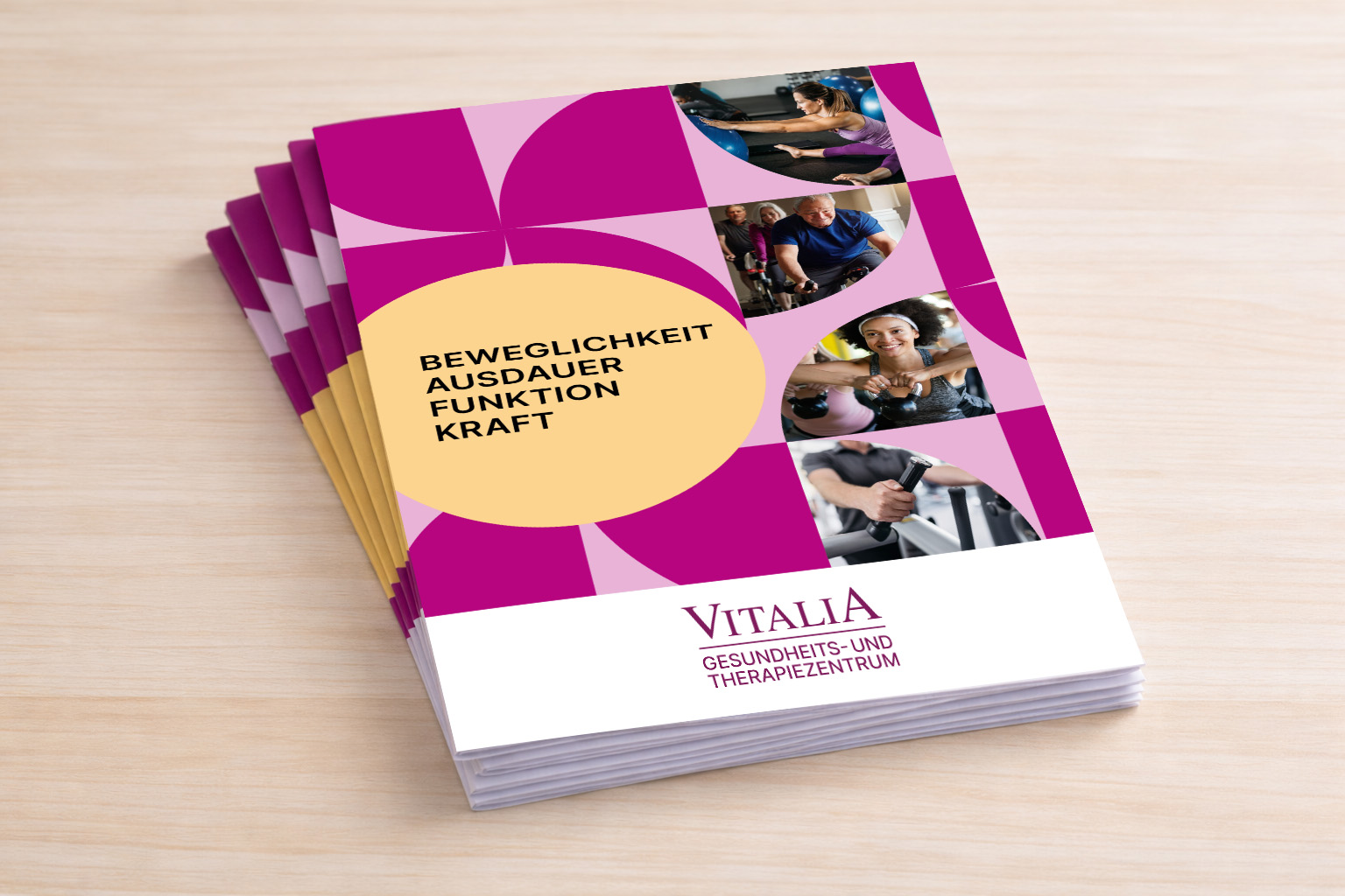 Beweglichkeit, Ausdauer, Funktion und Kraft: In unserer Broschüre erhalten Sie einen kompakten Einblick in das ganzheitliche Konzept des VITALIA Gesundheits- und Therapiezentrums.